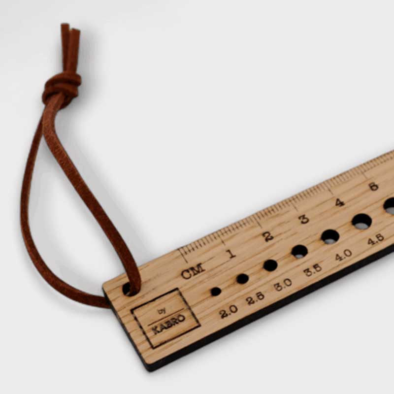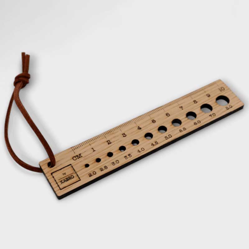 Pindemåler med lædersnor by KABRO. Elegant pindemåler i egetræsfiner med lædersnor. Måler pindestørrelser fra 2,0 til 8,0 mm samt længde op til 10 cm. Perfekt til strikketasken.