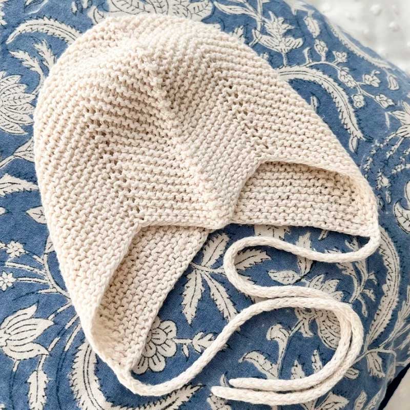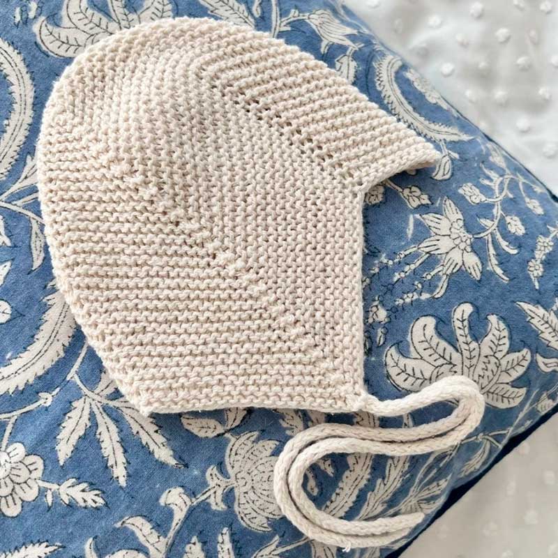 En tynd, retstrikket hue beskytter den nyfødtes hoved og ører og kan bæres både indendørs og udendørs hele året rundt. Huen sidder godt på panden og har et bindebånd under hagen. Den gode pasform skabes ved at tage ud og ind. Huen strikkes nedefra og op i retstrik, frem og tilbage på rundpinde. Huen sys til sidst sammen med en søm midt bagpå.