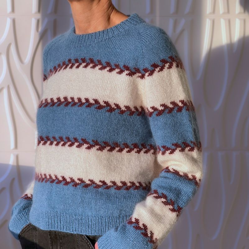 Sweateren strikkes ovenfra og ned eller omvendt med 1 tråd Sunday sammen med 1 tråd Tynd Silk Mohair.