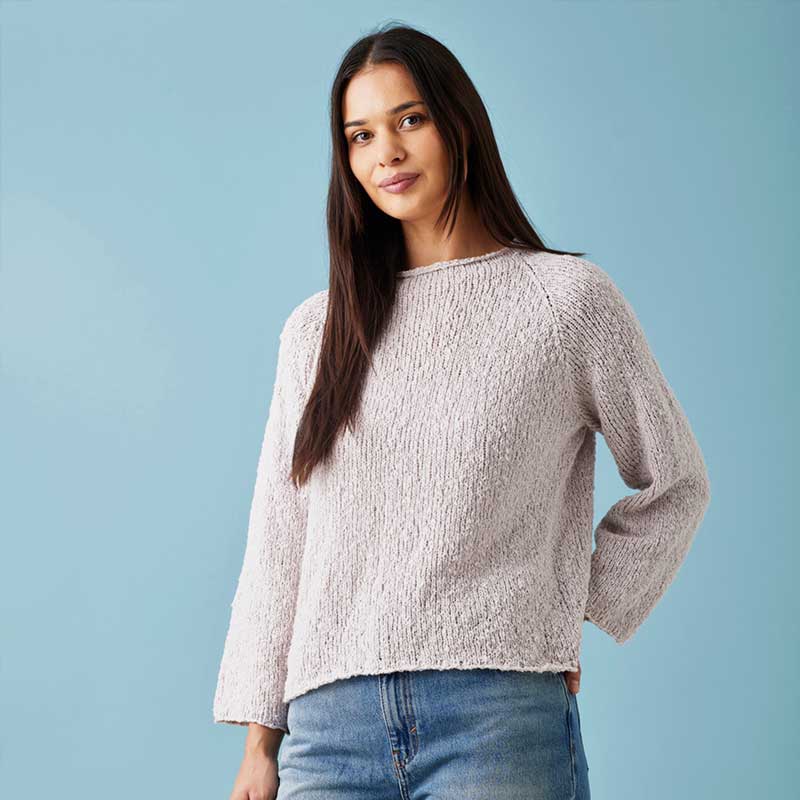 Bluse med rullekant i Ida garn fra Permin strikkes nedefra og op.
