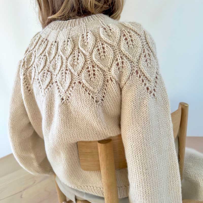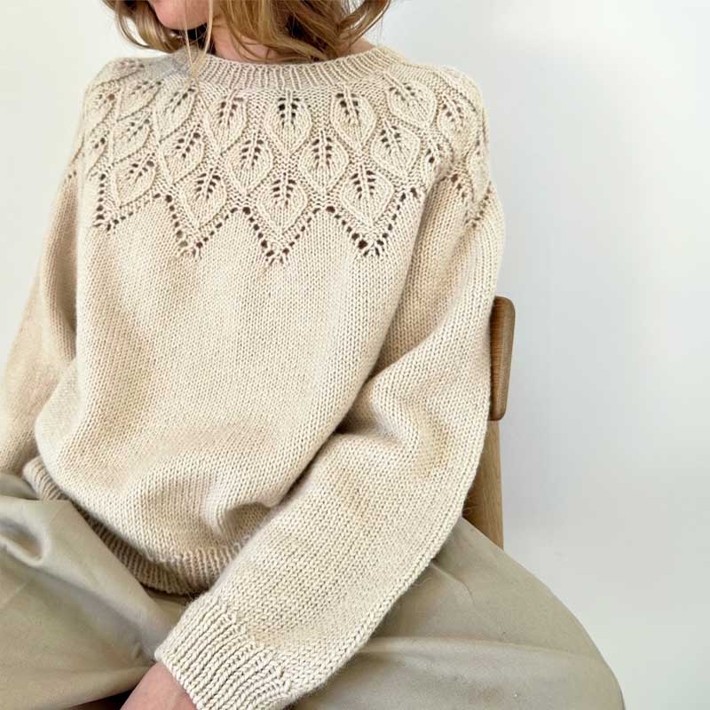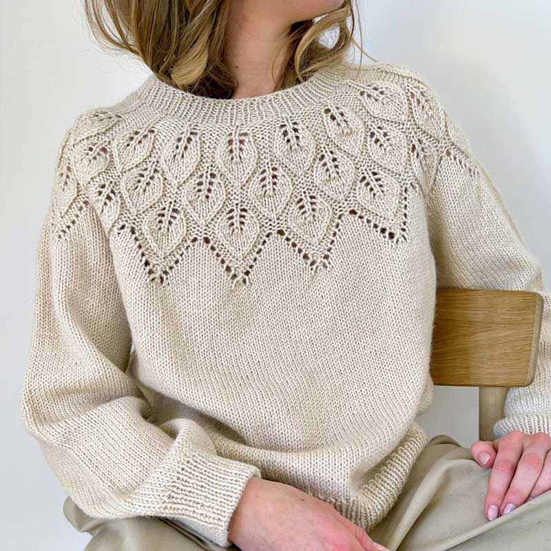 Det bladmønstrede bærestykke er underholdende at strikke og giver samtidig en fin pasform, fordi kombinationen af ret- og vrang-masker er så elastisk. Ella Sweater er strikket oppefra, og er strikket højere i nakken ved hjælp af vendepinde - God strik.