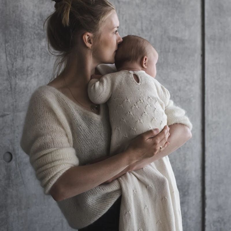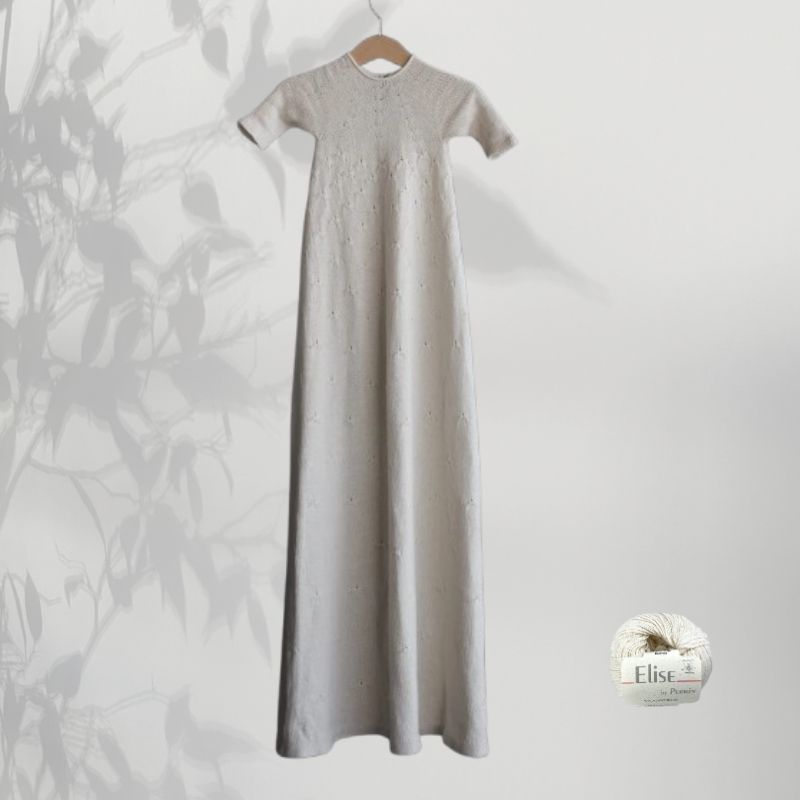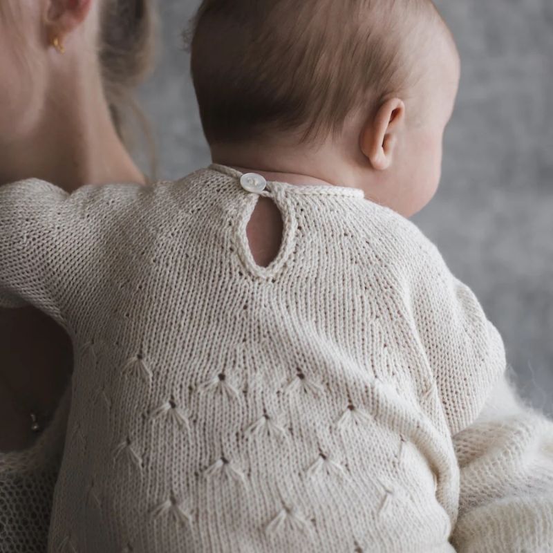 Den hvide Ellens Dåbskjole på billedet er strikket i Elise farve Offwhite [09].