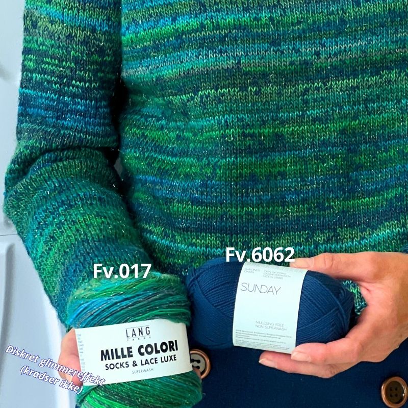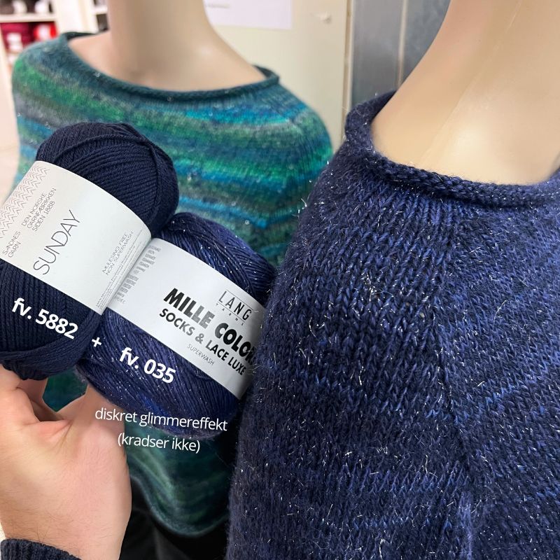 På billede 1 ses den strikket i Sunday farve 6062 'Mørk blå' og Mille Colori farve 017 'Grøn/Blå'