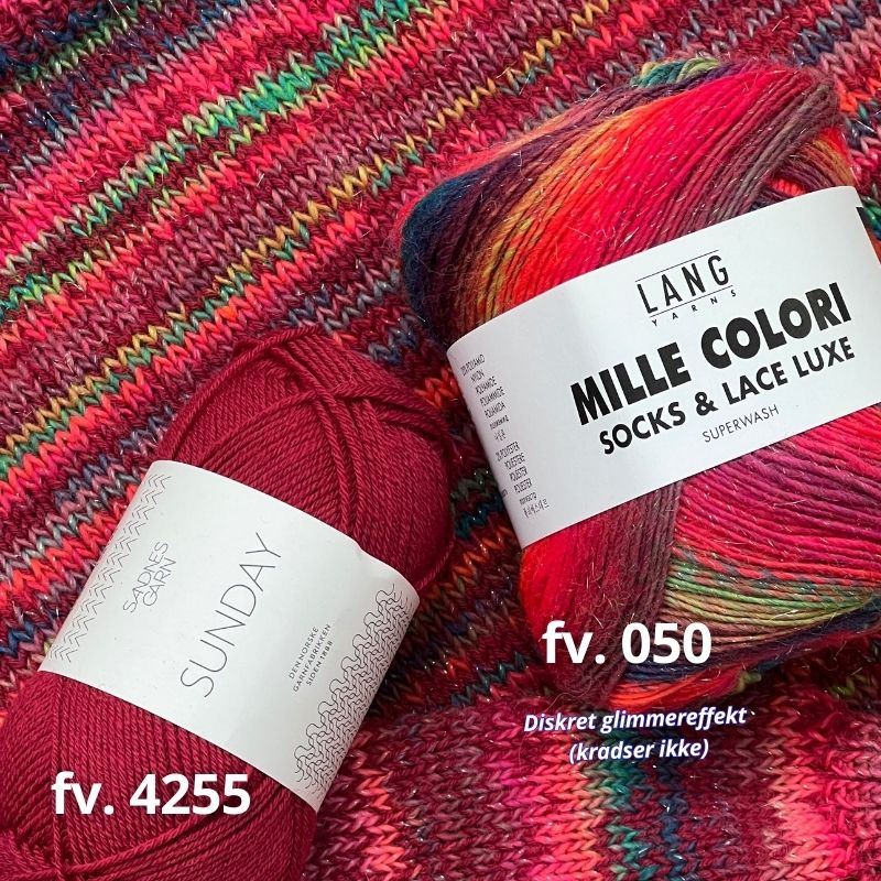 På billede 3 ses Sunday farve 4255 'Rumba Red' og Mille Colori farve 050 'Pink/grøn/blå/orange' strikket sammen