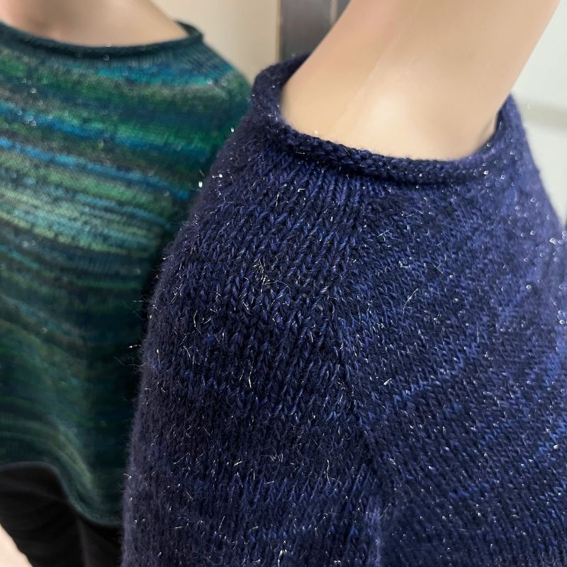 Ivy Blouse fra PetiteKnit kan strikkes oppefra og ned i ét stykke i Sunday garn fra Sandnes Garn og Mille Colori garn fra Lang Yarns.