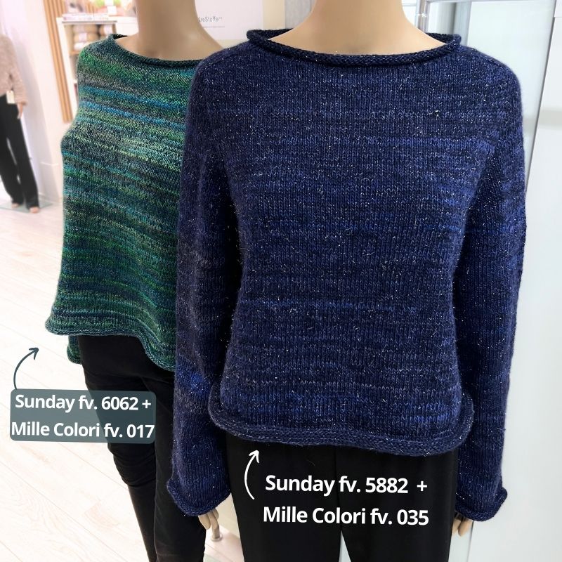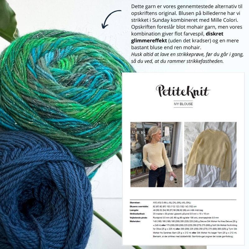 Dette garn er vores gennemtestede alternativ til opskriftens original. Blusen på billederne har vi strikket i Sunday kombineret med Mille Colori – opskriften foreslår blot mohair garn, men denne kombination giver flot farvespil, diskret glimmereffekt (uden det kradser) og en mere bastant bluse end ren mohair.