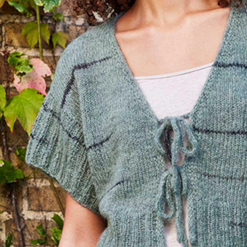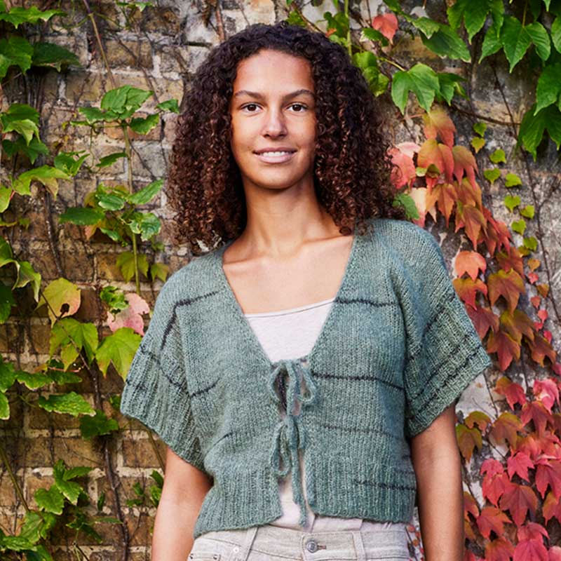 Kort trøje med I-cordkant og bindebånder er strikket i Nellie garn farve 11 Salvie/mørkegrøn. Bagstykket og forstykkerne strikkes sammen nedefra frem og tilbage på rundpind op til ærmegabet, med I-cordkanter på forstykkerne. Ærmerne samles op i ærmegabet og strikkes rundt i rib.