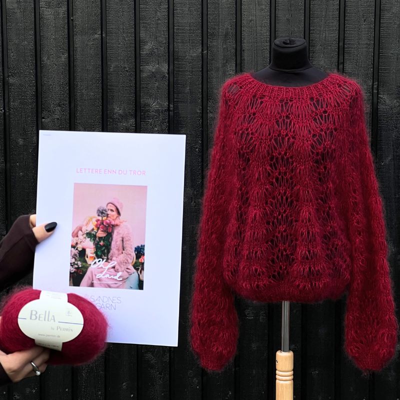 Bemærk: Vi har selv strikket den vinrøde på billederne i én tråd Bella farve 96 og er gået op på pind 8.