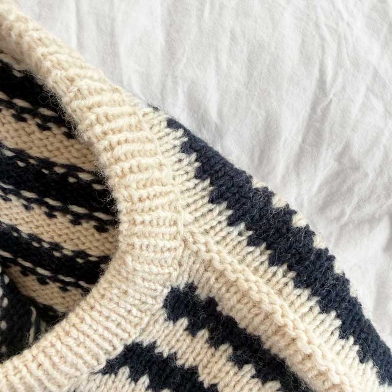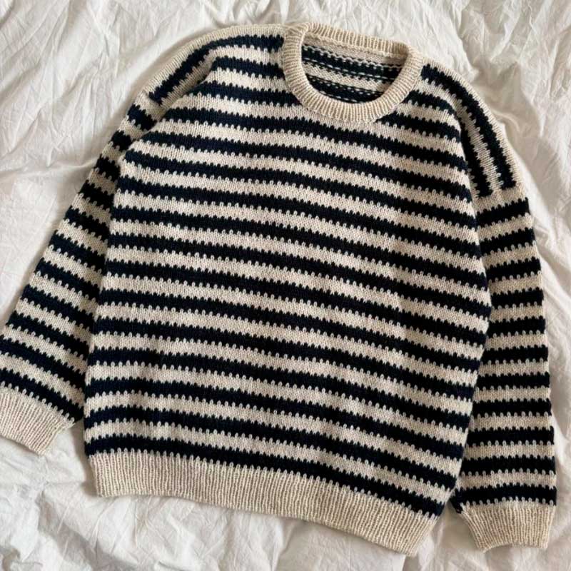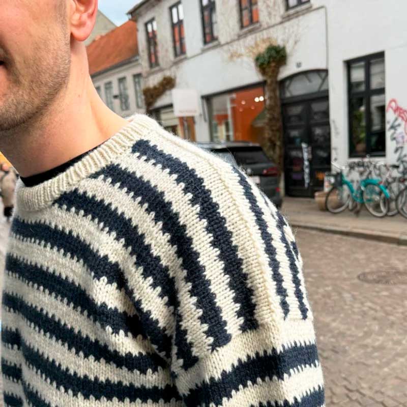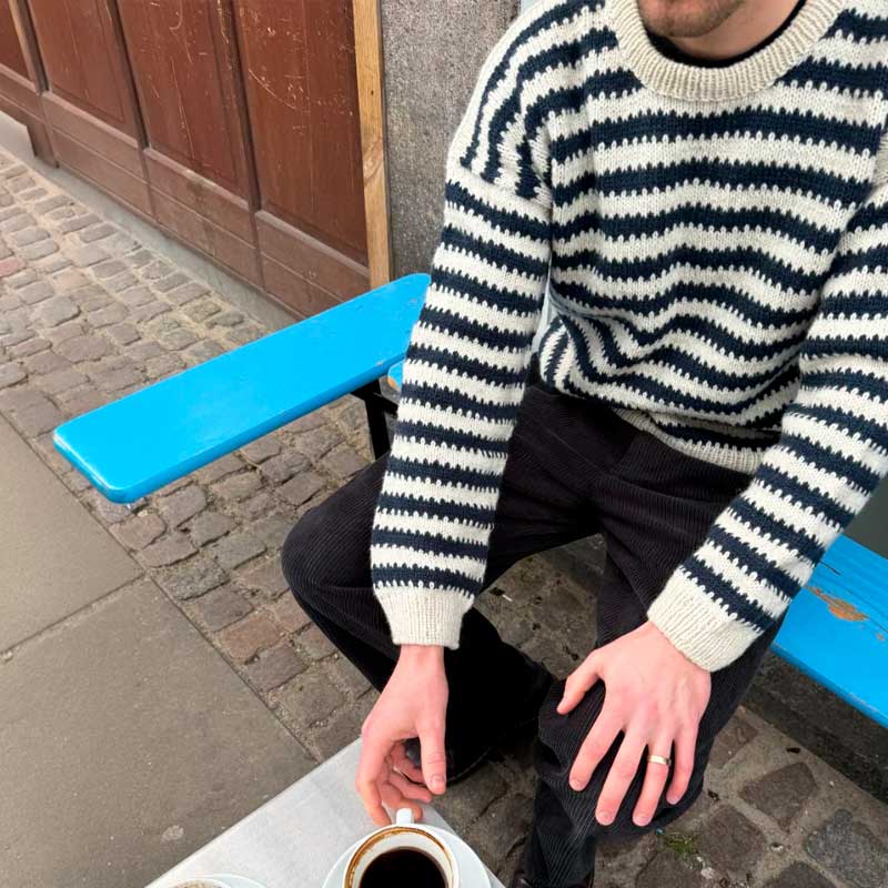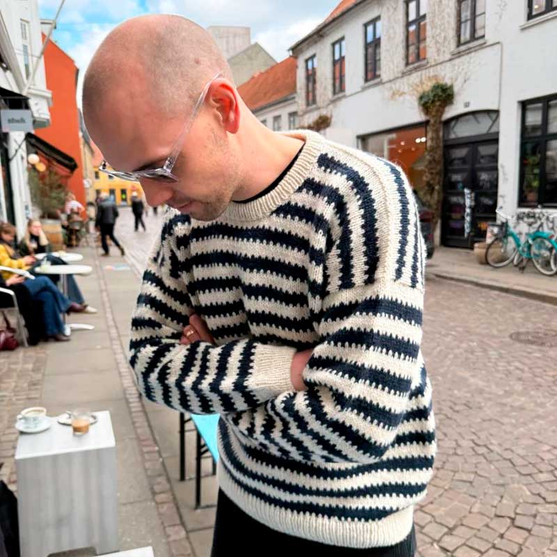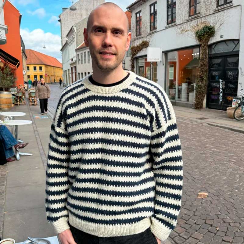 Otto Sweater Man strikkes oppefra og ned i et stribemønster i Atlas garn som tåler uldvask 30ºC i vaskemaskinen.