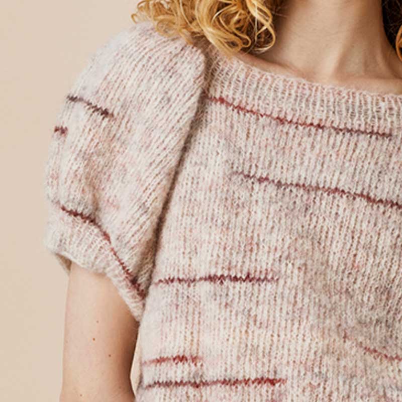 Raglan T-shirt med pufærmer er strikket i Nellie garn farve 08 Sart rosa/vinrød/rust..