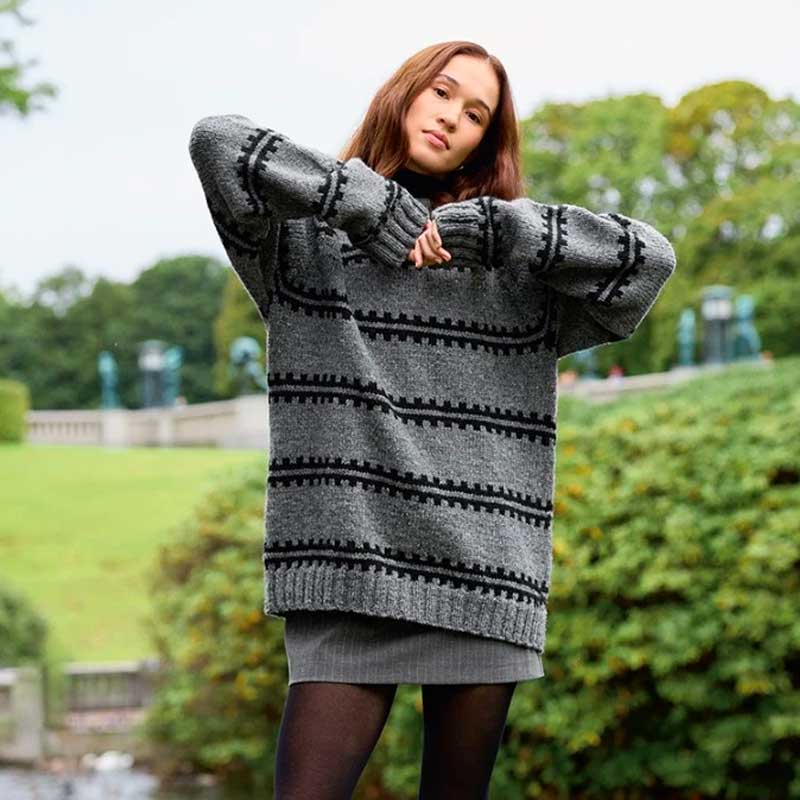 På billederne ses den strikket i farve 1055 (Mørkegrå meleret) som bundfarve og mønsteret er farve 1099 (sort)