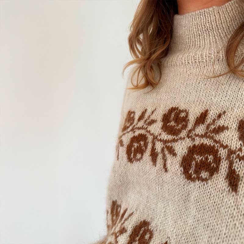 Rosie sweater fra Le Knit er en strikkeopskrift fra Lene Holme Samsøe, har to rosenborter på krop og ærmer, og den snedige konstruktion er en kombination af ærmekuppel og raglan, som betyder at al mønster kan strikkes rundt fra retsiden.