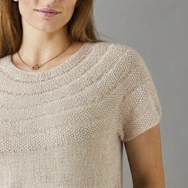 Kortærmet T-shirt med bærestykke i perlestrik i Leonora garn fra Permin strikkes oppefra og rundt.
