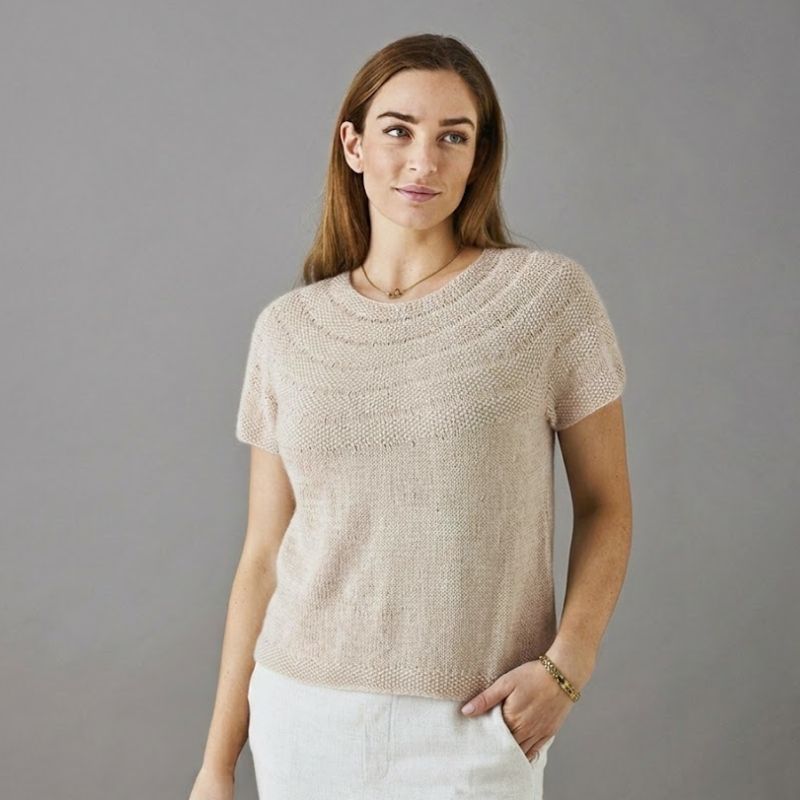 Strikkekit kortærmet T-shirt med bærestykke i Leonora garn
