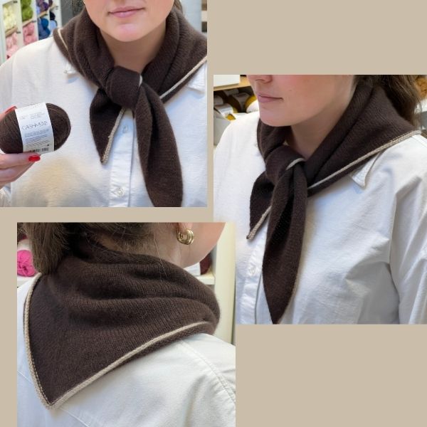 Uma Scarf strikkes indefra og ud med udtagninger på retsiden. Til sidst strikkes en kontrastfarvet kant langs to af siderne.