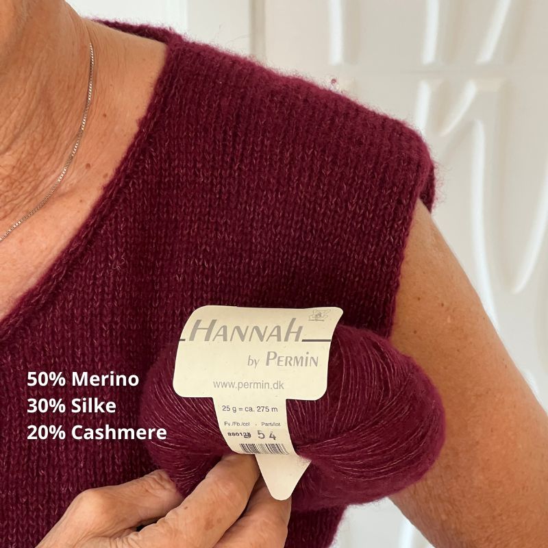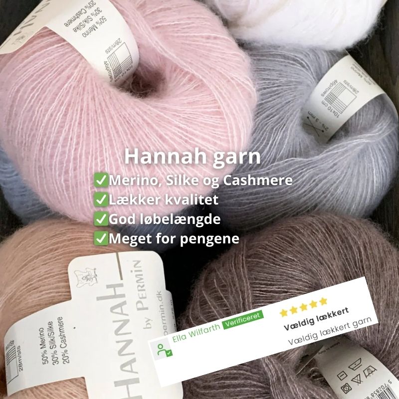 Hannah garn by Permin er et luksus garn, som består af 50% Merino, 30% Silke, 20% Cashmere. Det er et let og meget blødt garn. Hannah garn egner sig rigtig godt til tørklæder, vanter, sweatre eller som følgetråd med et andet garn. Garnet består af en ren silketråd inderst, der gør garnet stærkt og holdbart. Omkring denne silketråd, bliver der spundet en tråd af uld og cashmere, og det slutter med at tråden børstes. Kombinationen giver garnet et blødt og let udtryk. Løbelængde på Hannah garn er 275 m pr. 25 g, og der strikkes på pind 2,5-3 mm