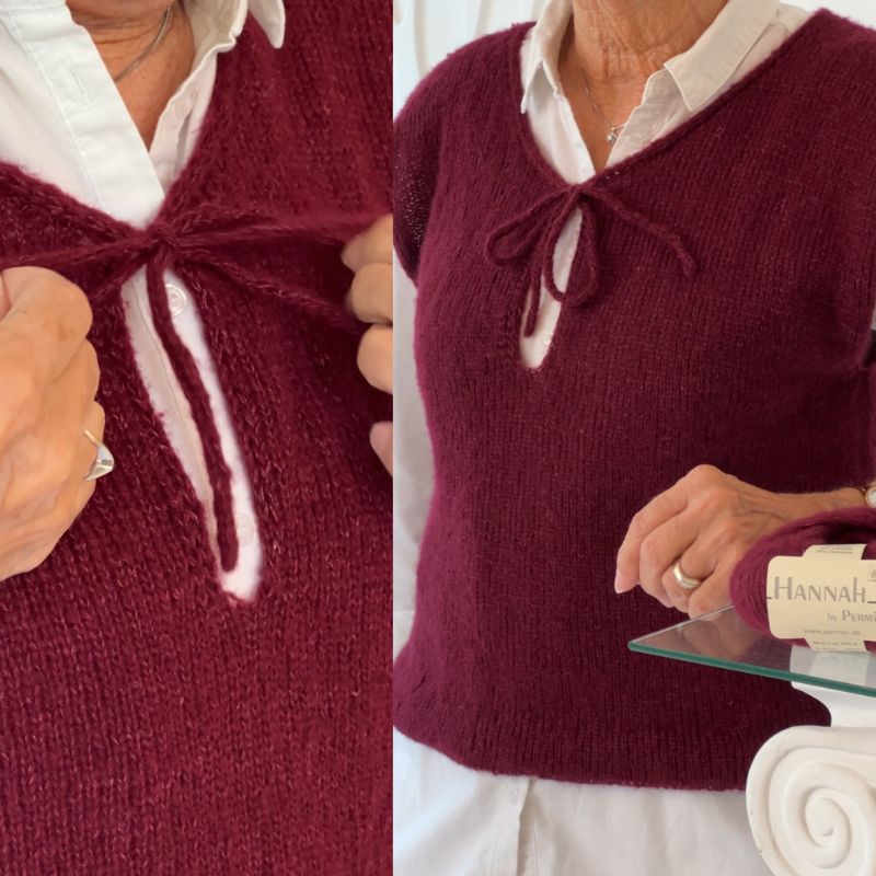 Hannah Strikkekit. Vest med slids i halsen og bindebånd fra Permin strikkes i 2 tråde oppefra og ned. i glatstrik med I-cord, med halsudskæring og sænket skuldre. God strik :)
