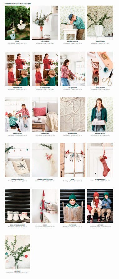 Endelig kan vi begynde at forberede jul igen. Der er noget magisk over denne tid på året. For alle os, der kan lide at klippe/klistre, lege og pusle, er dagene for få til at fuldføre alle projekterne. Tiden skal nydes med stearinlys, varm te eller kaffe og strik mellem hænderne. I denne samling er vi lidt nostalgiske, vi drømmer om en jul med traditioner, mens vi går ind i nutiden. Her finder du vintage inspirerede julepynt. Julepynt, julekugler, klokker og kræmmerhuse, der minder om bedste- og oldeforældrene. Vi håber at kunne inspirere dig til at strikke eller hækle noget specielt til en du holder af eller til dig selv. God jul!
