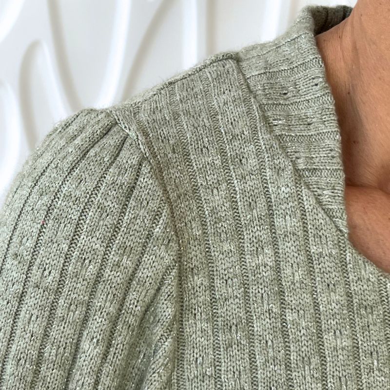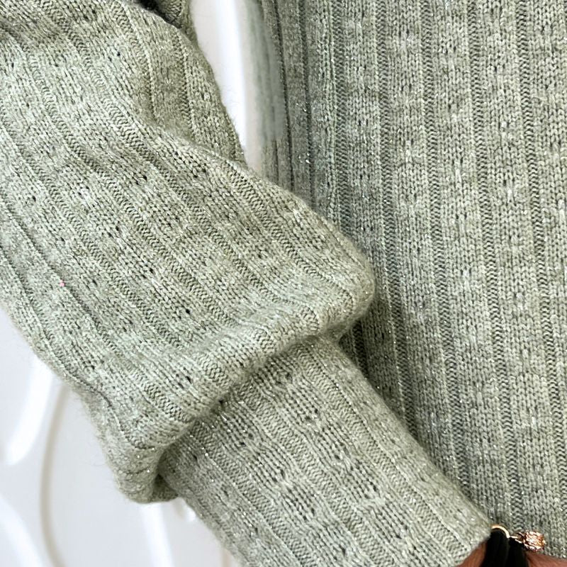 Strikstof med glimmer i lys olivengrøn. En blød og lækker metervare i strik kvalitet (330 g/m2), der holder dig behagelig varm.