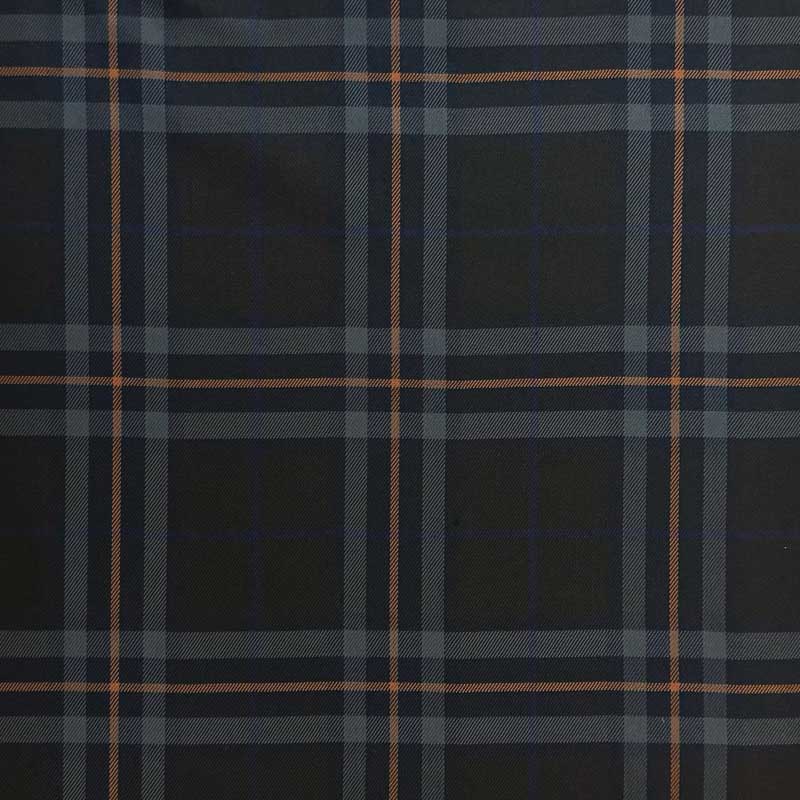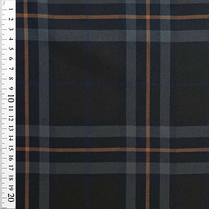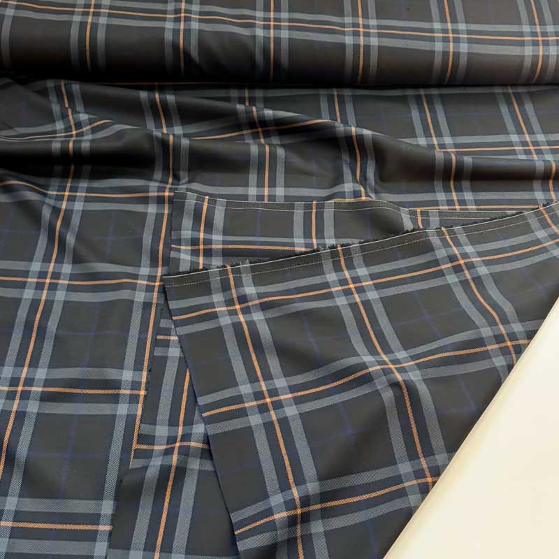 Ternet fastvævet vare med lidt stræk, i blå nuancer med cognac farvet stribe. En fin og lækker vævet kvalitet (249 gr/m2), som falder flot. God til overdele, kjoler, skjortebluser og bukser