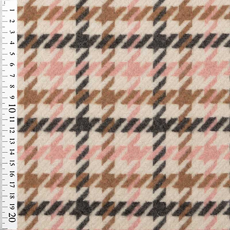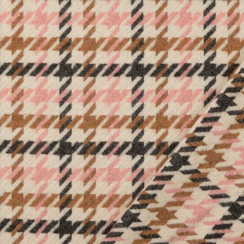 Ternet uldvare i lyserød, brun og sort på knækket hvid bund. En kraftig og blød metervare. God til jakke, nederdel spencer eller grov skovmandsskjorte. Egner sig ikke til bukser. (470 gr/m2).