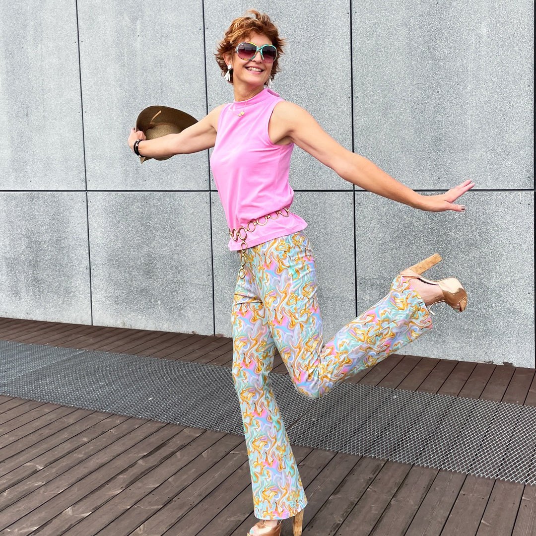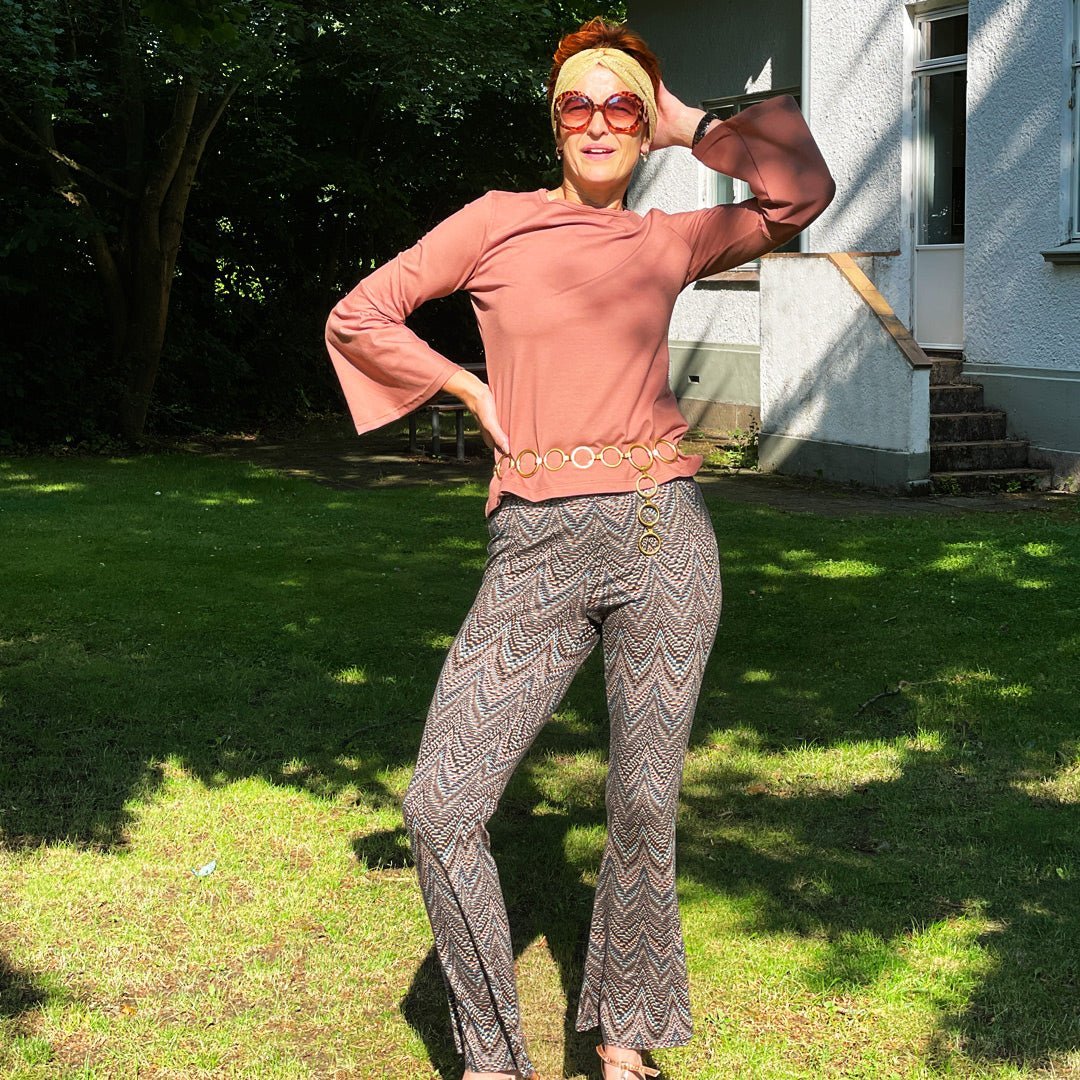 Line2Line snitmønster T619. Trompet buks med elastik i taljen til jersey eller strik. Niveau let. Med mulighed for at sætte sit eget præg.