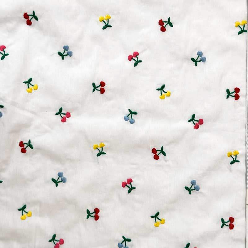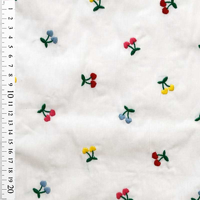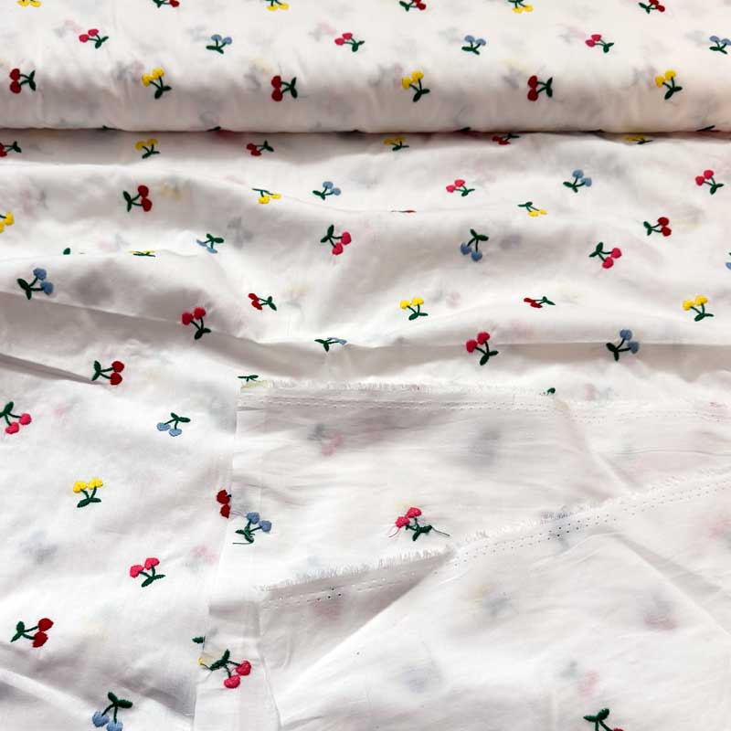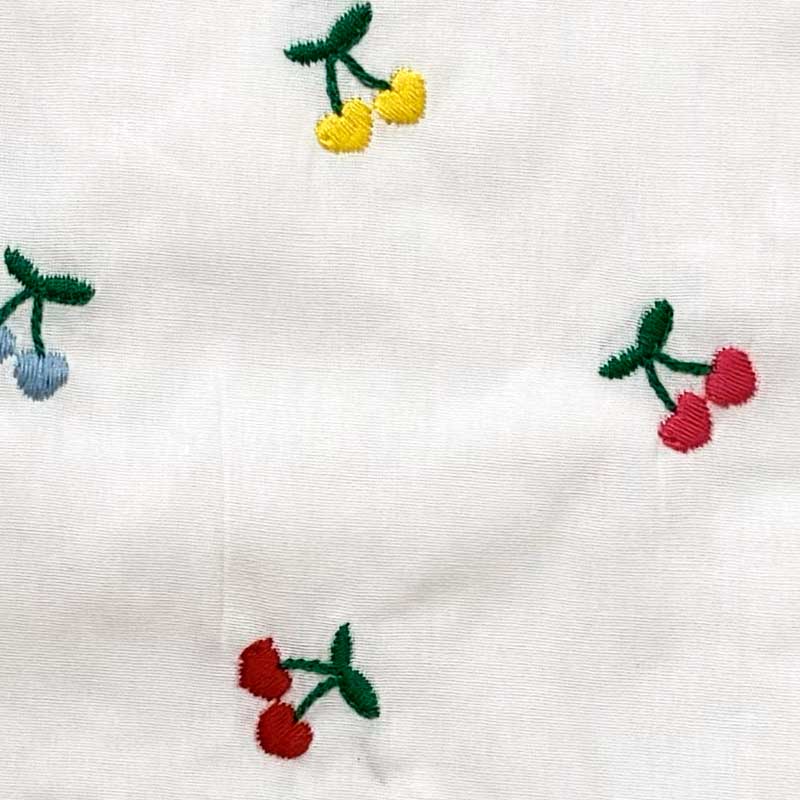 Tynd fast bomuld med kirsebær på hvid bund. En dejlig tynd kvalitet (114 gr/m2). God til overdele, kjoler, skjortebluser, nederdele.