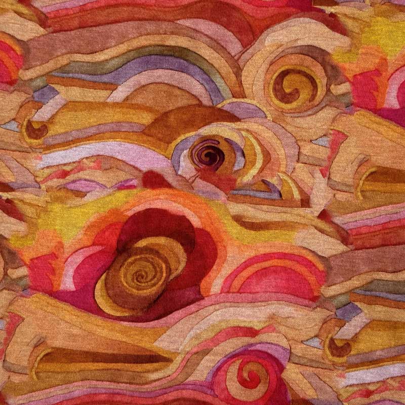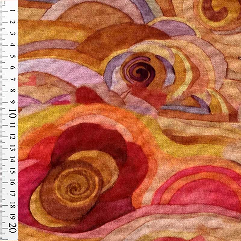 Vinter jersey med geometrisk print i gule og røde farver. En dejlig blød og kraftig kvalitet med sort vrangside (240 g/m2 ). God til cardigan, kjoler bluse/sweater m.m.