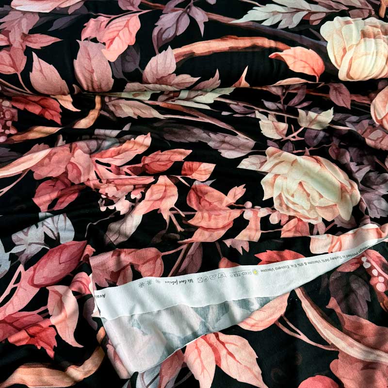 Digital viscose jersey med smuk blomst. En dejlig blød OEKO-TEX kvalitet. God til kjoler, tunika, bluser, nederdele og overdele.